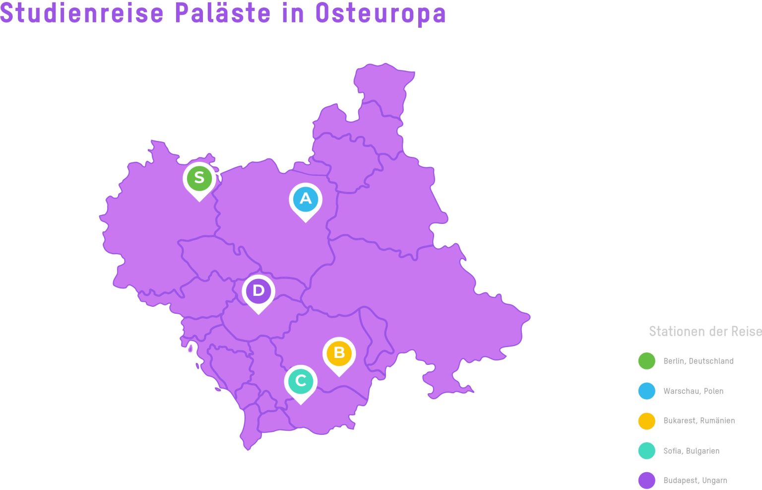 Das Programmteam, also Kolleg*innen aus unterschiedlichen Arbeitsbereichen der Stiftung Humboldt Forum, verreiste im Dezember 2022, um Paläste und andere politisch & sozial wirksame Orte zu besichtigen, die einst östlich des »Eisernen Vorhangs« lagen. Wir nahmen das Stichwort »Kulturpalast« zum Anlass, um Schnittstellen von Vergangenheit & Gegenwart zu erkunden und Kontakte für zukünftiges Arbeiten zu knüpfen. Nebenbei lernten wir uns gegenseitig noch einmal neu und anders kennen. Unser Vorwissen war unterschiedlich – viele sind zum ersten Mal in Polen, Rumänien, Bulgarien und/oder Ungarn.